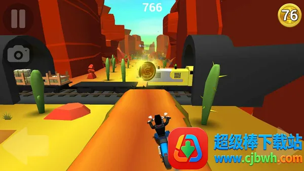 1. 玩家可操控摩托车手穿越各类障碍,在山峦间灵活躲避仙人掌、岩石、车流、火车等重重危险,最终成功抵达终点。