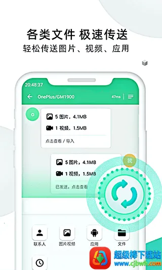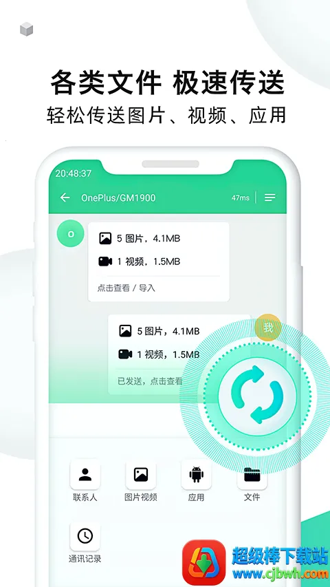 2. 各类文件极速传输:能在60秒内极速换机,轻松传送通讯录、通话记录、图片、音乐、视频、应用、电子书等数据,速度远超蓝牙。