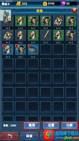 6、而点击背包则可以看到我们所获得的装备图鉴,你可以将其装备,也可以整理,更可以将其分解;