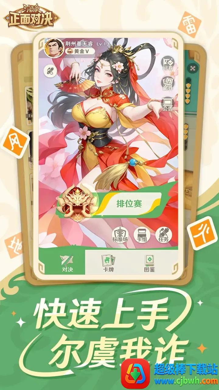 想体验刺激的三国题材卡牌对战吗?那就来看看《三国杀正面对决》吧!这是一款轻社交快节奏的卡牌对战游戏。在这里,你能自由组建卡组,在三条交战区布阵交锋。通过巧妙部署角色、运用锦囊妙计,还有随机天命事件,感受“我预判了你的预判”这种烧脑的智力博弈乐趣。游戏节奏明快,上手容易但精通可不简单,它不止是牌局对弈,更是心理上的激烈博弈。每一局都充满变数与惊喜,让你仿佛置身于真实的三国战场,尽情享受策略对抗的快感,满足你对三国题材游戏的所有期待。快来加入这场精彩的三国对决吧!