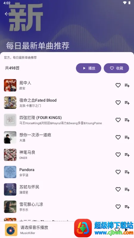 MusicKiller是一款出色的免费音乐应用。它提供大量优质歌曲,无需会员无广告,有无损音质,体验感超棒。其个性化设置贴心,无缝播放模式多样,界面简洁易用,离线播放方便。搜索歌曲便捷,还能查看歌词。优势明显,能尽情听歌、搜索歌手作品,支持创建播放列表和收藏。亮点突出,可解析歌单、识别专辑歌曲,多种音质下载且能试听,音乐库大,全网大部曲库都有,热歌新歌随时听,让用户随时随地享受纯净天籁。