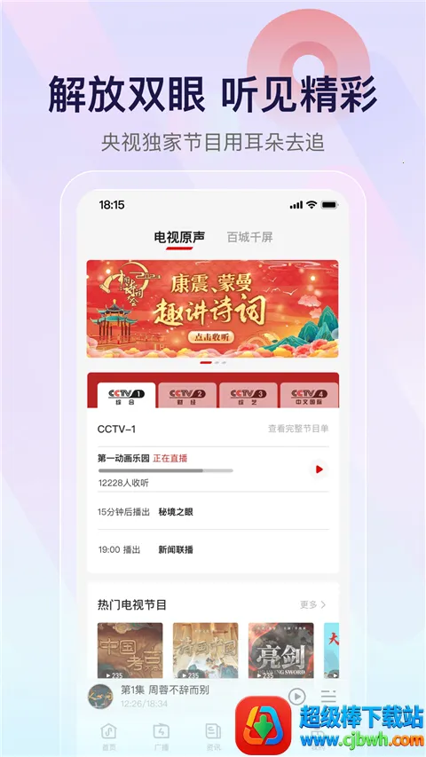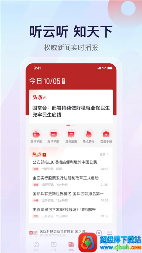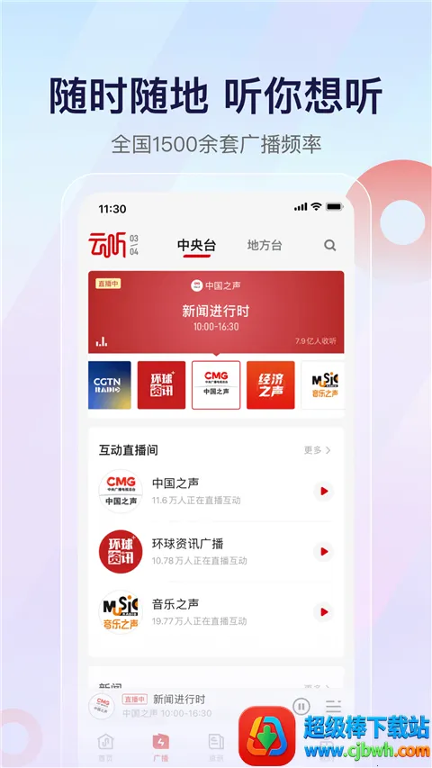 央广云听是中央人民广播电台重点打造的广播音频软件。资源丰富,涵盖英语、健康、感情等多种类型,还有不同领域电台节目。能运用5G网络流畅收听,带来高品质声音内容,享受听觉盛宴。不管是看小说、听相声广播都轻松搞定,一部手机满足多样需求。随时随地可用,睡前收听故事伴你入眠。还会推荐热门电台资源,让你轻松打发时间并学习知识,是款不错的音频软件。