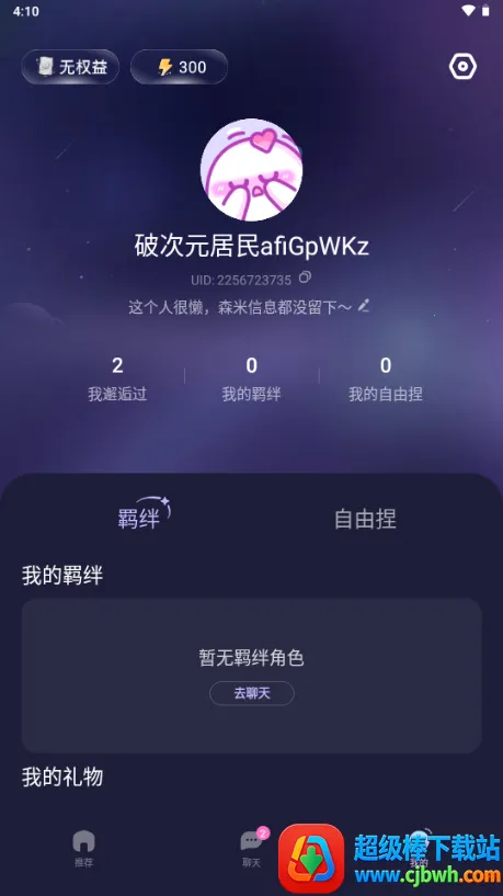 破次元恋人旧版是一款虚拟伴侣社交软件,用户能依兴趣设定创建专属AI男友或女友,与之自然聊天互动,分享心情。有超多精美立绘、24小时暖心相伴等功能,还可体验约会、礼物等系统。