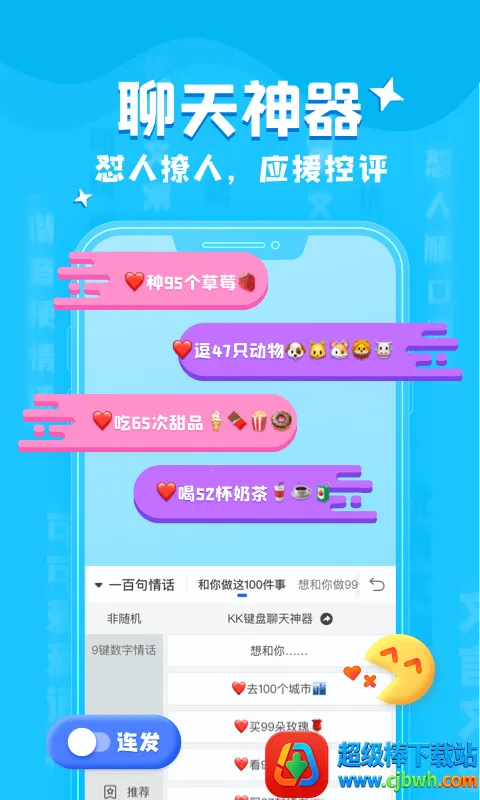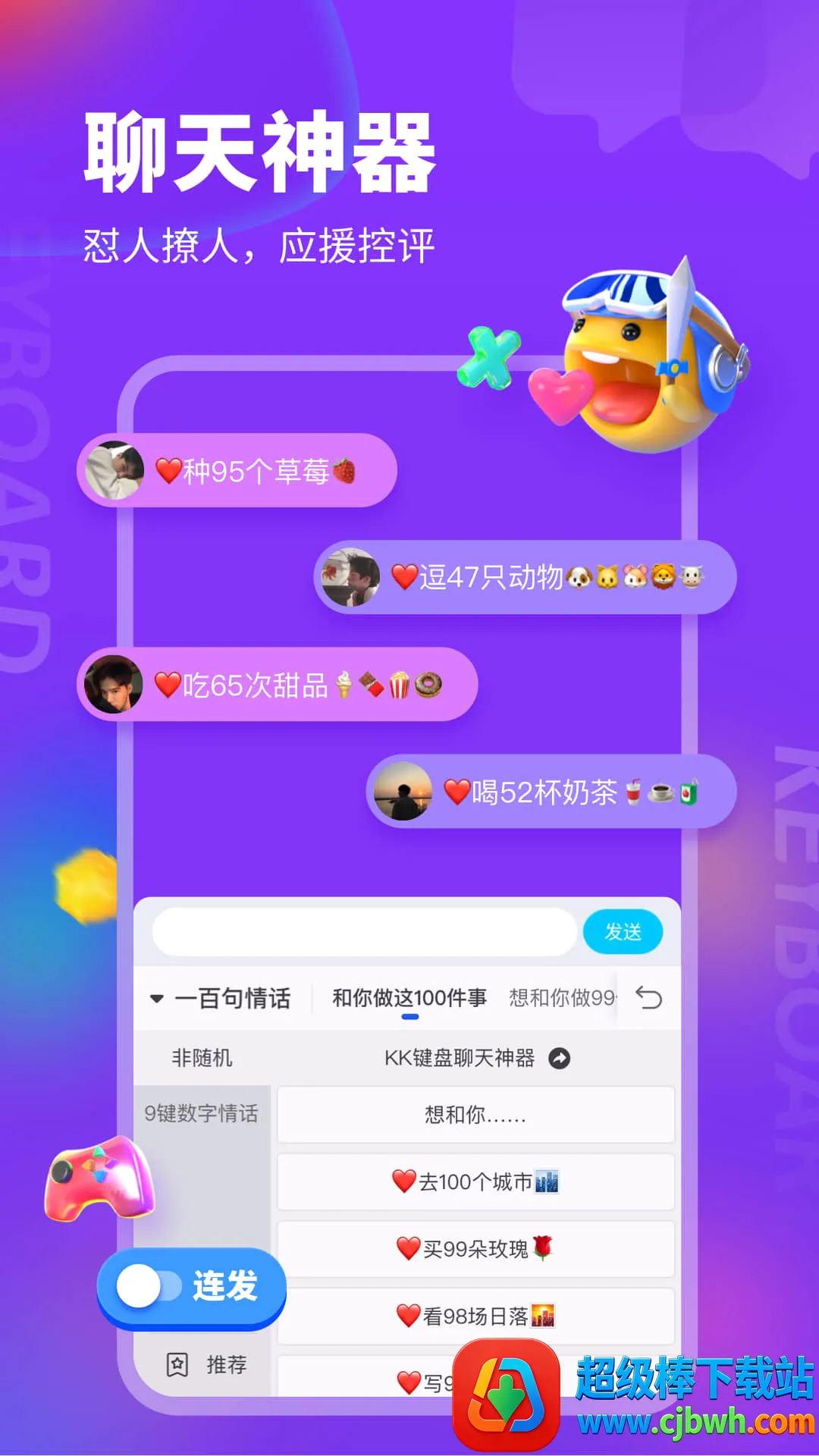 2. 提供一键连发功能,快速刷屏或高效回复,同时兼容特殊符号输入和创意表白内容。