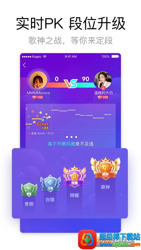 酷狗唱唱K歌App是全民在线K歌平台,依托酷狗正版曲库,有海量高品质伴奏、多种顶级音效。具备专业音效、智能打分等功能,界面清爽无广告,操作简单,还能社交互动,让你畅享K歌乐趣。
