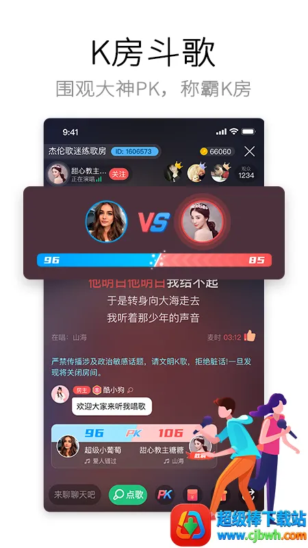 4、K歌社交互动:支持合唱、1V1斗歌、排位赛、直播互动等,涵盖社区赛事、家族联谊会、兴趣圈子,支持关注、点赞、评论、打赏,构建立体社交网络。