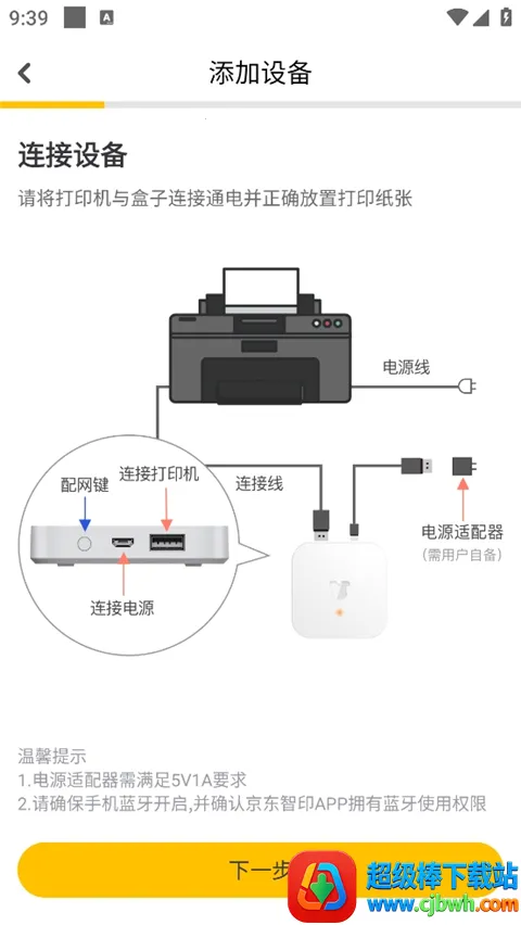 注意:确保打印机已连接电源并开启,将京东智印盒子与打印机按照说明书的指导连接起来。