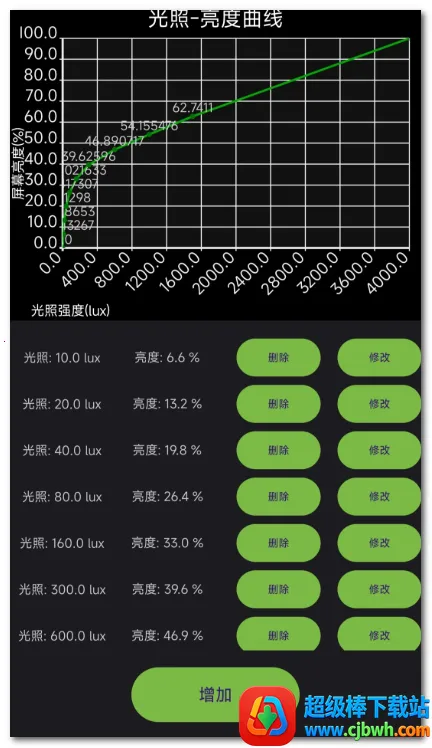 设有亮度调高容差、亮度调低容差以及亮度 - 光照曲线设置界面,可通过增减修改光照 - 亮度对应点调整亮度 - 光照曲线。