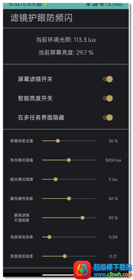 2. 自动模式切换:环境光照变化时,自动关闭或打开屏幕滤镜,还能开启系统自动亮度。