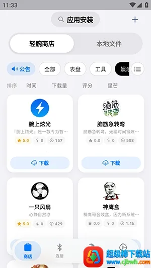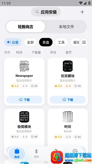 软件首页显示多种手表应用及表盘皮肤供选择,直接点击想下载的内容可快速安装,点击连接选项能扫描连接手表设备,点击工具选项可导入小说文件。
