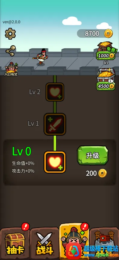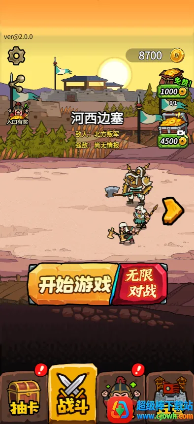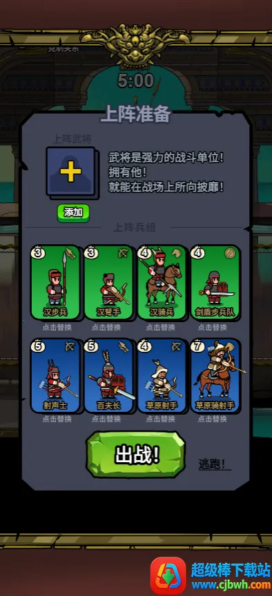 4、武将参战:局外抽卡得武将,战斗中可召唤,其独特技能加成兵种,抽卡保持库存。