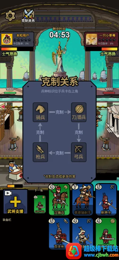 1、兵种相克:骑兵克刀盾,刀盾克弓兵,弓兵克枪兵,枪兵克骑兵,巧妙运用克制关系对战。