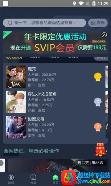 1、下载安装完成后打开应用,进入首页即可浏览系统推荐的热门漫画内容。