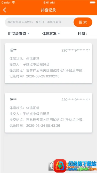 4. 排查记录查询:可通过多种方式查询排查记录,包括被排查人身份证号、姓名、手机号,以及站点、时间段、体温状况等筛选条件,点击具体记录还能查看详情。