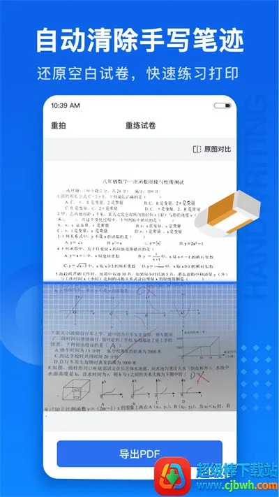 智能擦除:通过拍照识别试卷,能自动清除手写笔迹,轻松还原干净空白试卷,方便再次使用。