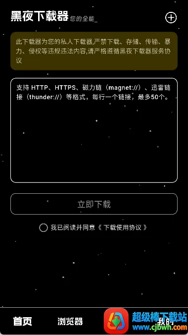 黑夜下载器是一款超棒的全能型磁力下载工具。它能轻松帮你把所需资源下载到手机上,支持多种下载协议,像磁力链接、BT种子和迅雷链接等,粘贴链接就能自动识别并下载,操作超方便。使用时,先打开软件同意用户协议和隐私政策,进入首页在输入框粘贴下载链接,点击立即下载按钮或右上角“+”号新建BT任务,授予存储权限后,就能在下载界面查看和管理任务啦。它免费使用,无需付费或开通VIP就能享受高速下载等服务,适合下载各种格式文件,如视频、音频、PPT、电子书、压缩包等。还支持ftp、https等多种下载方式,能快速识别解析链接文件,支持批量下载,有多个搜索引擎方便找资源。采用多线程加速技术,极速下载,稳定可靠,有断点续传、智能调度和错误恢复机制,边下边播超便捷,影视爱好者用它超合适!