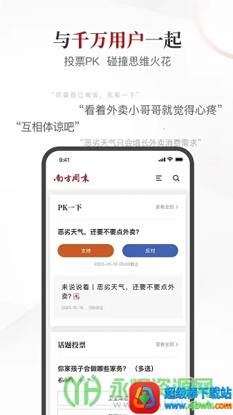 南方周末最新手机版是南方周末杂志电子化平台,提供独特视角深入报道。涵盖多领域,有精选内容、互动社区等功能。坚持独立报道,具时效性、深度内容,支持个性化定制,无广告干扰,还有多媒体阅读体验。