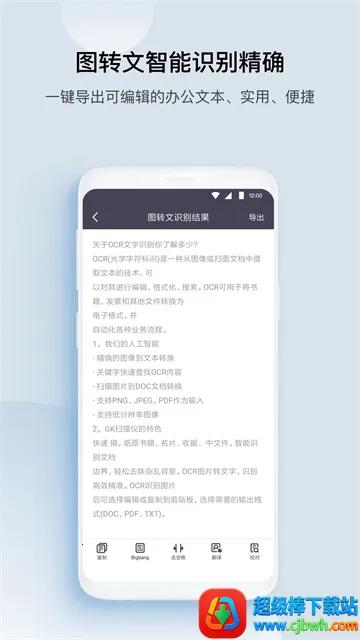 1. 智能OCR文字识别:采用智能OCR文字识别技术,能针对汉语、英语、法语等56种不同国家的语言进行识别,精确地识别出图像中的文字,还可任意编辑复制。