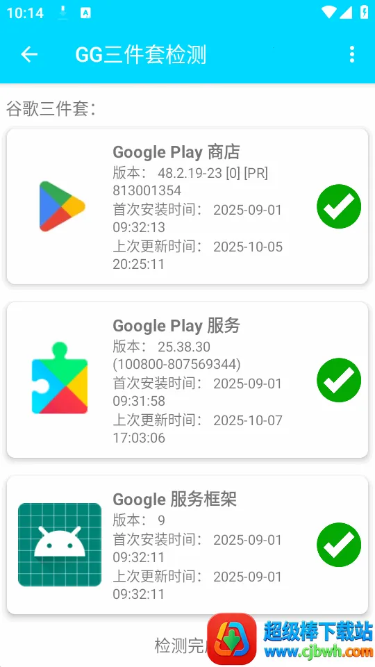 3. 快速检测:迅速得出手机三件套是否安装、版本及更新时间等结果。
