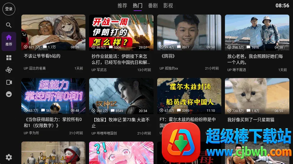 2、选择一个喜欢的视频打开,包含了推荐,热门,番剧,影视。