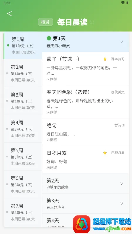 3、设有每日晨读模块,重读与泛读结合培养语感,支持听跟读与学习记录,通过晨读勋章与排行激励孩子坚持每日朗读,提升理解力。
