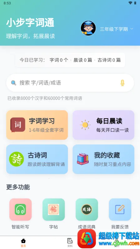小步字词通是面向小学全年级的语文辅助工具,涵盖生字词、古诗文及笔顺拼音等核心内容。内置海量资源,支持智能听写、拍照批改、每日晨读与古诗词背诵,助力孩子夯实基础。