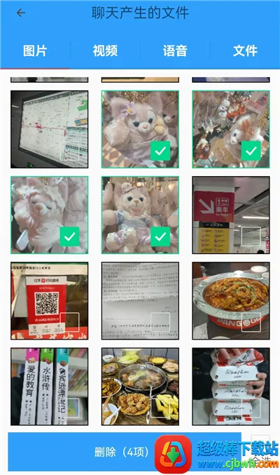3、勾选需要删掉的图片,视频、语音和文件同理,然后点击下面的【删除】。