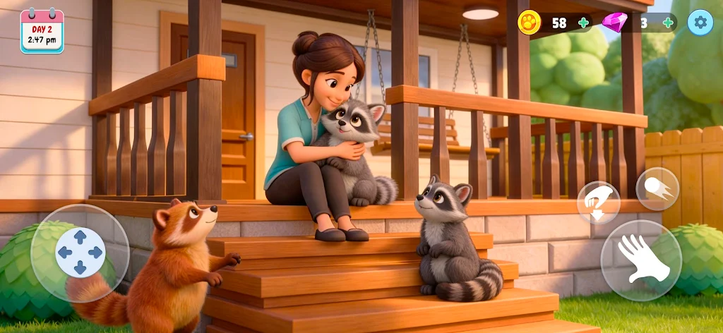 游戏营造了一种自然融合的生活节奏,让玩家能够通过简单的关爱行为,感受内心的平和和喜悦。这里没有时间限制,也没有复杂任务,只有缓慢流淌的生活画面和轻柔的背景音乐,帮助你沉浸在真实的关怀体验中。无论是观察浣熊们探索周围环境,还是陪它们玩耍和休息,每一刻都温馨而惬意。