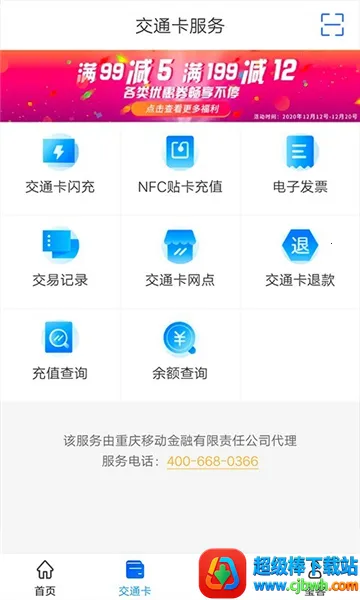 2. 交通卡服务:支持NFC贴卡充值和闪充充值,满足不同手机用户需求;可查询交通卡余额、飞充记录、交易记录及服务网点等信息。
