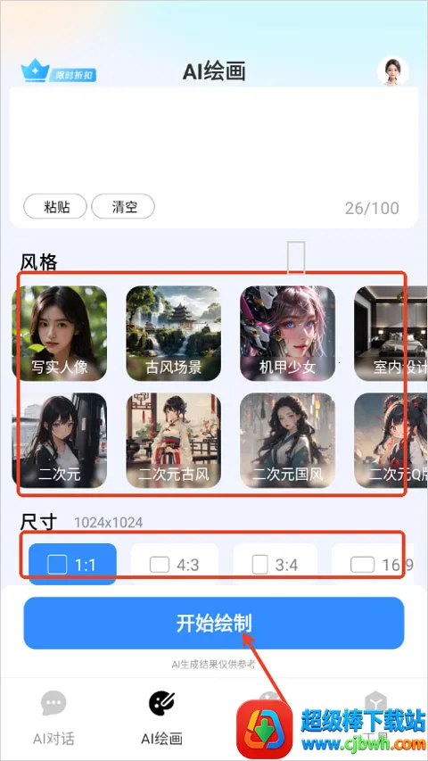 3、选择你要的风格和尺寸,然后点击开始绘制即可;