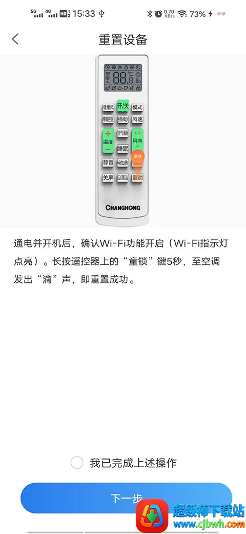 4、将空调通电并开机后,确认Wi-Fi功能开启(Wi-Fi指示灯点亮)。长按遥控器上的“童锁”键5秒,至空调发出“滴”声,点击下一步。