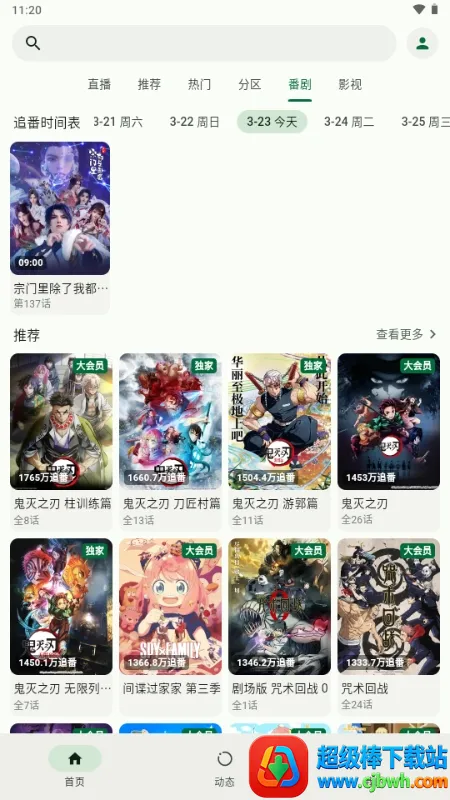 提供了超多内容,如直播、番剧以及推荐内容,还能对播放画质进行设置。