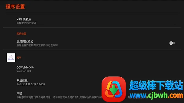 CCWebTv升级版本超棒!它是电视与AndroidTV深度定制的开源直播浏览器,升级后超厉害。有全新点播功能,电影、剧集、综艺、短剧都能看,从单一直播变综合娱乐平台啦。节目内容大幅扩充,频道从40个扩展到165个,还有轮播节目和电台音乐节目。纯音频有可视化特效,听广播时能看到动态波形和频谱,超有趣。定时睡眠功能贴心,可设自动停止播放时间,不用担心耗电和影响睡眠。性能与兼容性也双重优化,页面加载快,频道切换流畅,适配各类电视盒子和智能电视,低版本安卓系统也能稳定运行,老旧设备也减少了卡顿和崩溃问题,看直播、点播超方便,赶紧来体验吧!