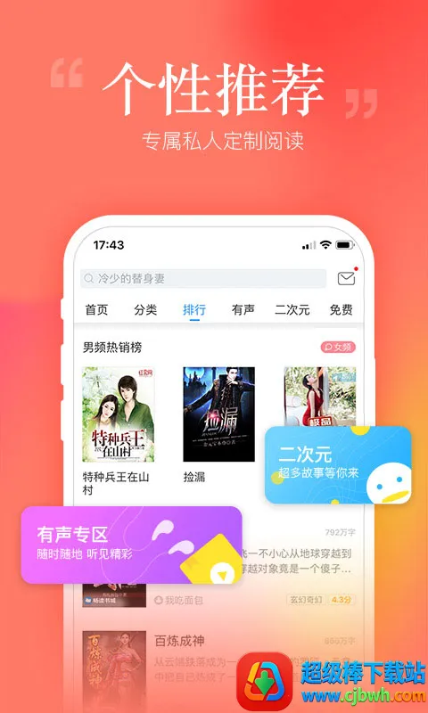 海量资源:涵盖都市言情、霸道总裁、玄幻修仙等超人气网络小说类型,网罗海量小说资源,各种原创高质量正版书籍,专业编辑精挑细选,每日更新。
