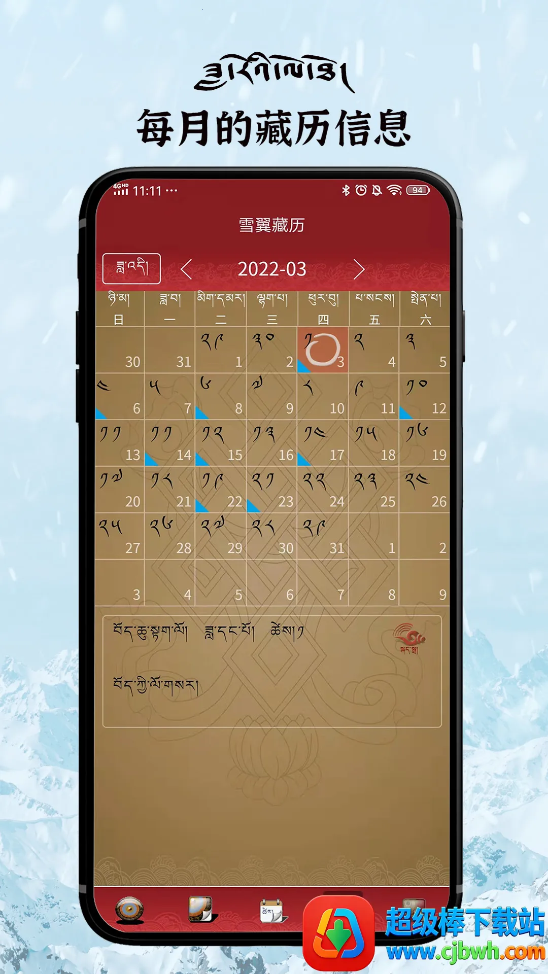 其特色显著,拉萨语真人语音播报带来亲切听觉体验;整体视觉设计满是西藏民族风情;界面全藏文显示,有多种精美传统藏文字体可选。亮点也不少,藏历数据权威且持续更新,确保准确时效;复杂的藏历星宿五行吉凶等元素清晰呈现;整合了法定及传统节假日信息。