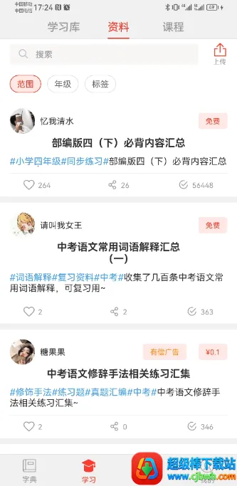 3. 丰富学习辅助:有真人发音、笔画演示、组词成语、近反义词等功能,还附带生字表等学习资料。
