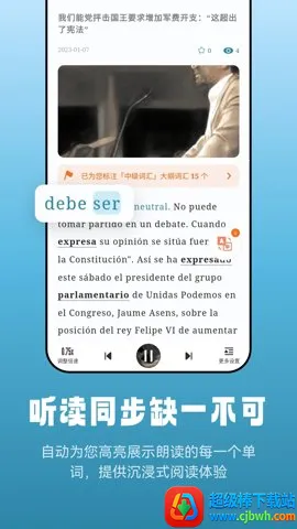 1. **分级阅读与听力训练**:依据欧洲语言共同参考框架划分阅读材料等级,涵盖多种资源类型,提供逐句播放、循环复读、调节语速及智能语音高亮跟随功能,强化听读联动。