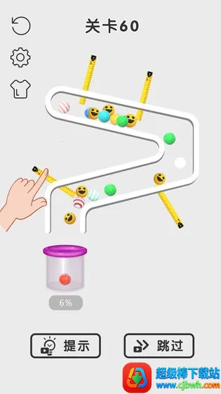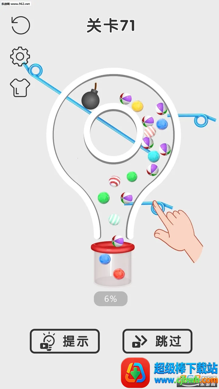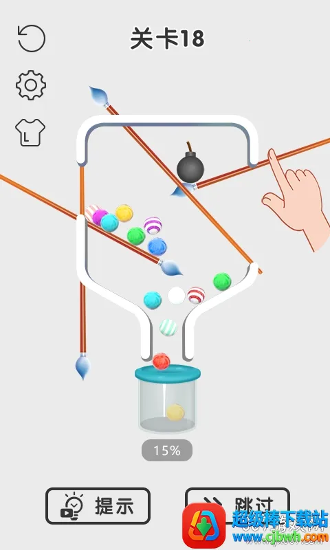 触屏操作简单易控,您需仔细观察瓶子里的机关布置,合理拉动拉针,避免炸弹掉落,同时要将无颜色小球合理染色后顺利收集。
