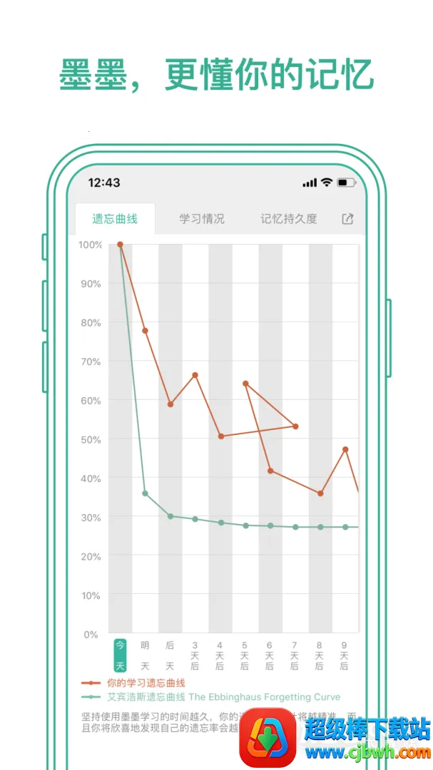 3. 可通过记忆持久度遗忘曲线的辅助分析,让用户更好地规划单词记忆方法,及时查漏补缺。