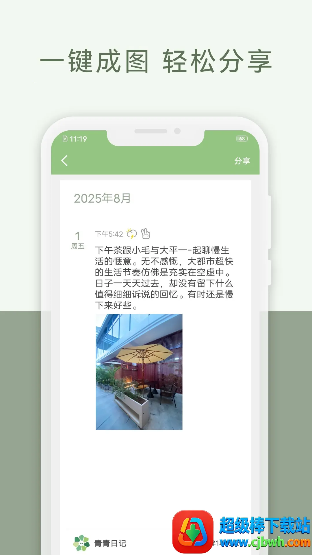 青青日记是一款很棒的生活记录与情绪表达应用。它能满足你记录生活点滴的需求。界面简约清新,能带来沉浸式体验。记录方式丰富,可文字与图片结合,还能添加心情和天气。