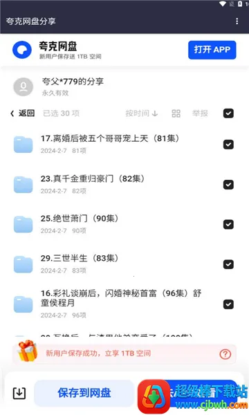 这软件功能超强大,界面简洁操作方便。它能汇聚全网丰富的网盘短剧资源,每天实时更新,追剧不愁没新剧看。支持多种云盘,像夸克、阿里云盘、迅雷、百度云等,无会员无广告,直接就能保存观看。而且搜索功能很厉害,设置好网盘时间和过滤后缀词,搜索结果直接复制到网盘中打开就行。还能根据你的观影习惯智能推荐,满足个性化需求。有了它,随时随地都能轻松找到想看的短剧,再也不用为找剧发愁啦,赶紧来试试吧!