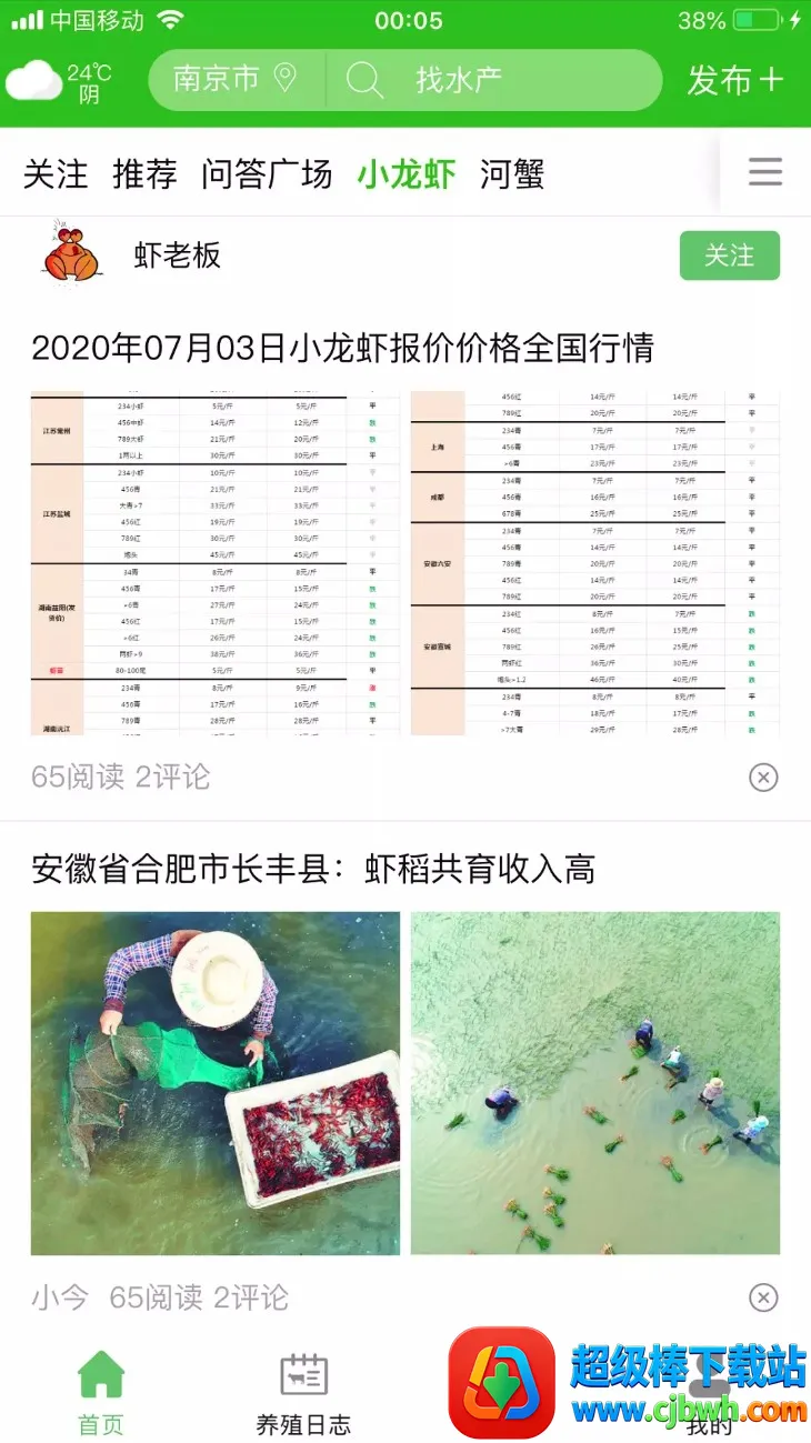 点击上方分类栏中的小龙虾或河蟹等品类,即可浏览对应的行情报价、资讯养殖日志与地区动态,让您及时掌握市场动态。