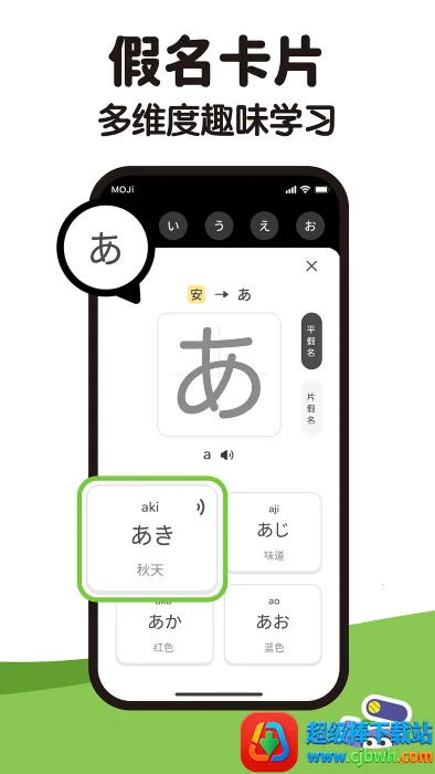 2. 假名卡片学习:提供假名卡片,方便用户查看单词内容来学习。