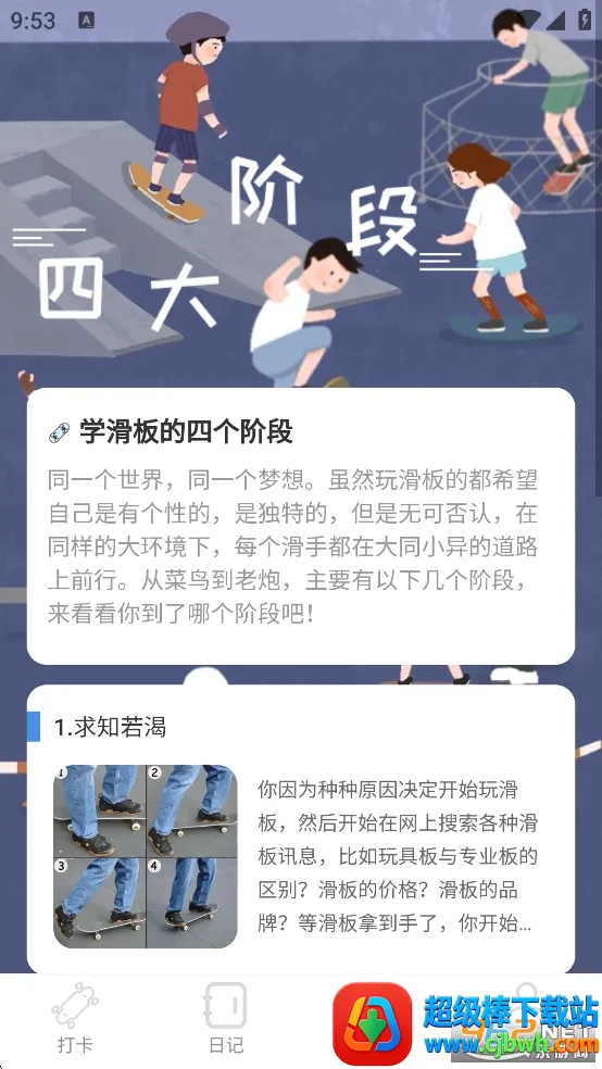 3、新手指南:针对刚学滑板者,对滑板可能了解有限,通过指南可知晓滑板四个不同阶段,助其感受滑板乐趣。