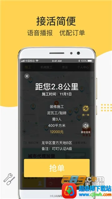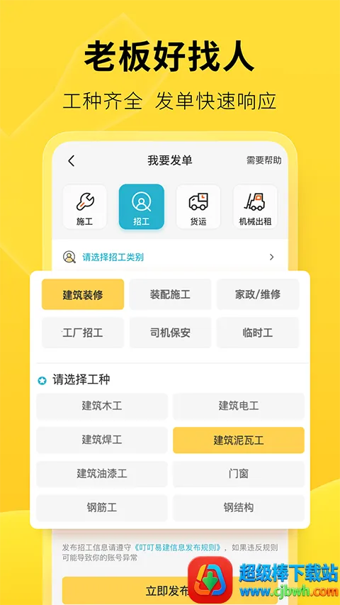 发单模式下,不管是新房装修、旧房翻新还是家居安装等需求,一键发单就能搞定,可找建筑工友施工、机械出租、运输搬运等。听单模式里,水电工、泥瓦工等各类工种都能找到适合自己的活,语音实时播报,优配订单,一键抢单就行。企业还能免费入驻,认证专属工人,解决施工质量难题。