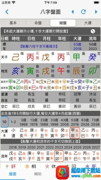2. 运势分析:提供细盘功能,详细分析当前大运走势,预测当年及明年流年运势,结合二十八宿信息,助用户全面了解自身命理格局。