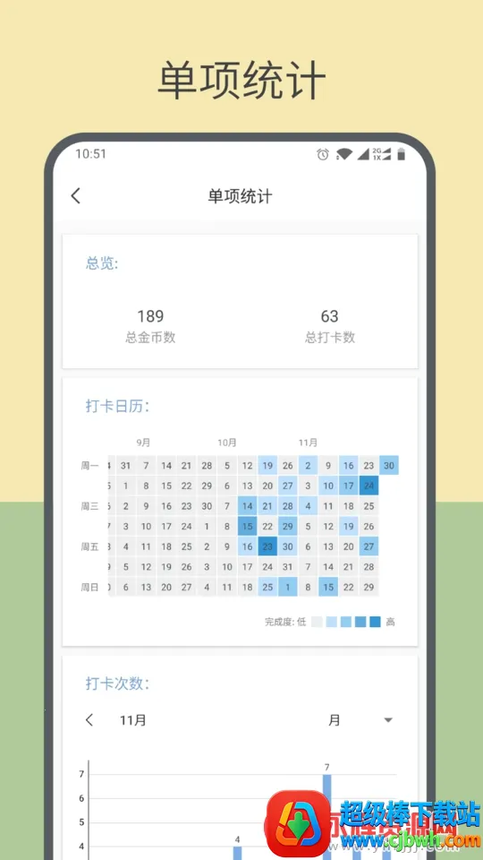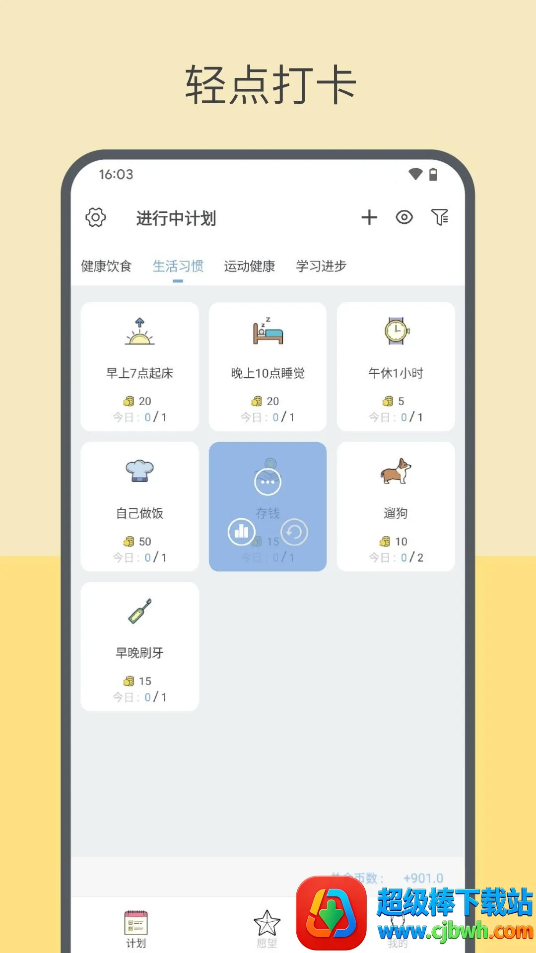 1. 极简计划列表:待完成计划一目了然,轻点即可确认完成,金币奖励即时到账,还有防误触设计,可撤销误点打卡记录并收回奖励金币。