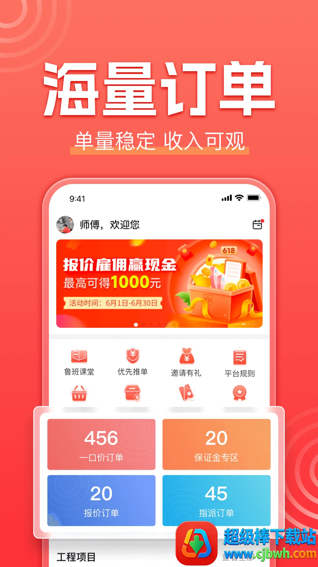 海量订单资源:平台覆盖全国600城市3000区县,大量本地周边订单及时推荐提醒,让师傅随时随地都有接不完的订单。