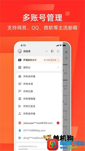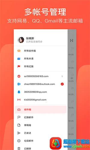 1. 多邮箱集成管理:支持添加网易、QQ、Outlook等主流个人邮箱,收件箱和聚合文件夹清晰,不同邮箱来信区分明确。