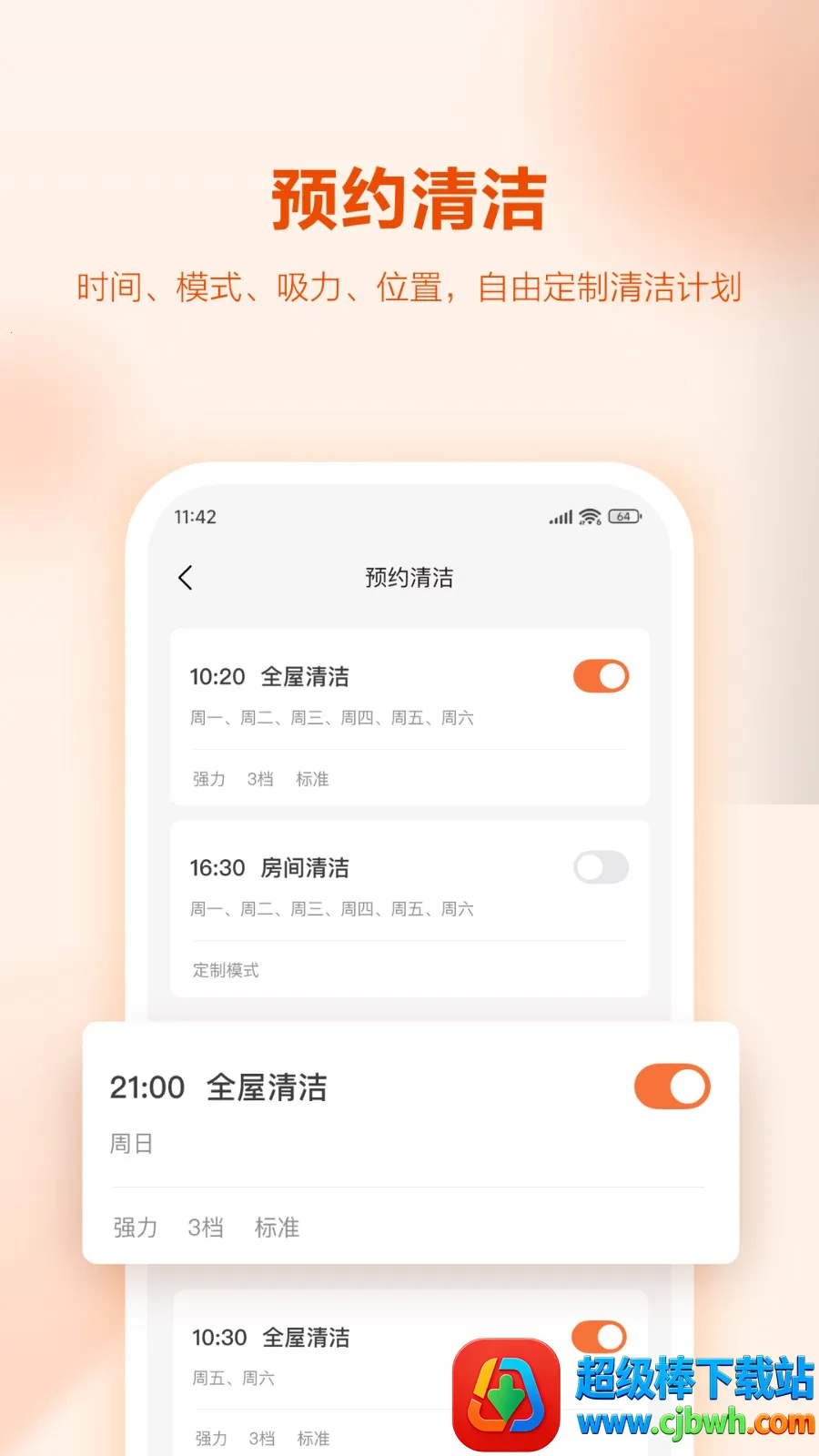 2. 能制定清洁计划并查看进程。即使不在家,也可远程操控扫地机器人,通过UWANT HOME安卓版就能为机器人安排清洁任务,还能随时了解清洁进度。
